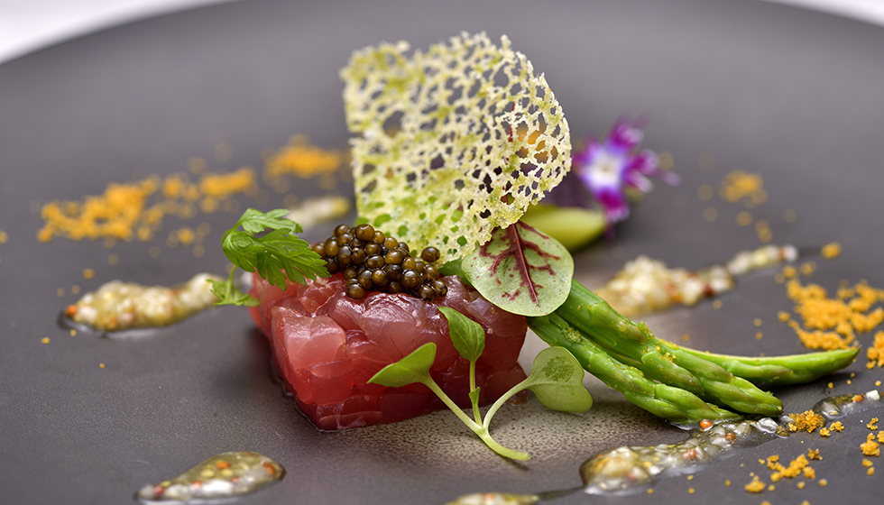 この時期のシーズナルコースディナーは沖縄の食材を中心に、旬の恵みや国内外から厳選した上質な素材を組み合わせ、春の息吹を皿の上に描き出します。魚料理は新鮮な沖縄県産の本マグロに、この時期でも青々と輝く南国の畑の恵みを香らせて。メインディッシュはその時々に旨味のピークを迎えた素材の“瞬感”にもこだわり、一期一会の味わいをご提供いたします。