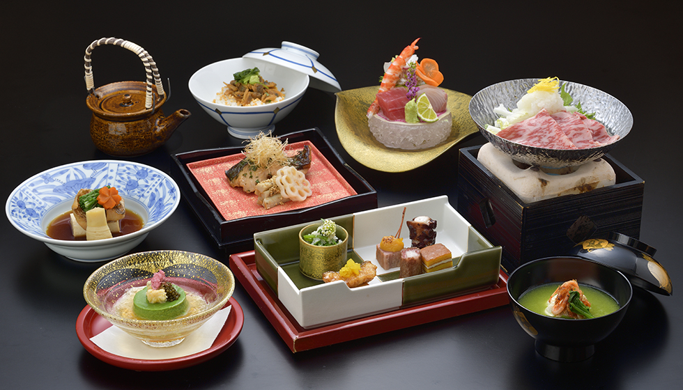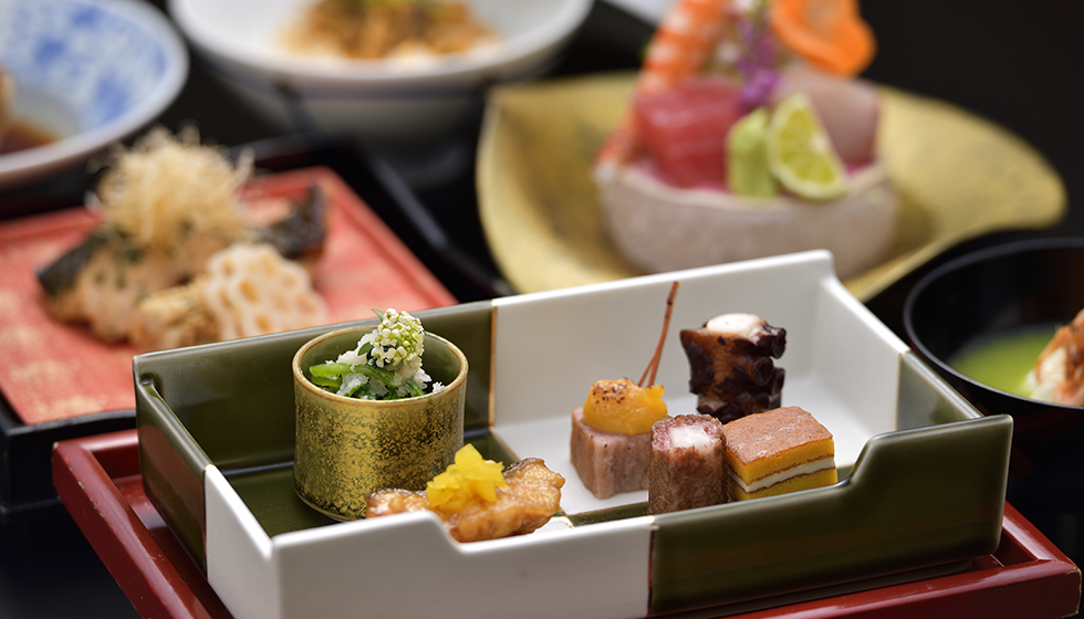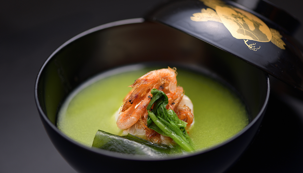 春に旬を迎える素材を贅沢に用い、緑と花が芽吹く華やぎを表現しました。季節の山海の幸を取り合わせた前菜は、ウドの黒毛和牛巻など、料理長の斬新な発想を加えた美味も並び、吸物はうすい豆を裏ごしし、鮮やかな緑色に仕上げる伝統的な逸品です。筍、ハマグリ、あさり、山菜など、春の色と香りが活きる会席で特別な時をお過ごしください。