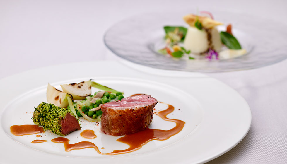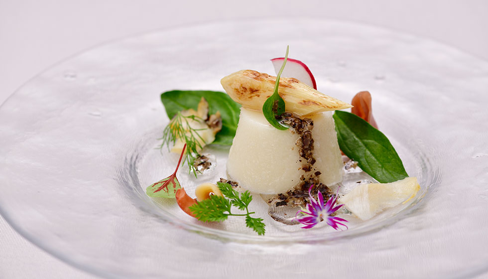 沖縄の旬の食材とフランスなどから取り寄せたシェフこだわりの食材を用い、春の余韻から緑豊かな夏へと移りゆく自然の流れをコースの中にも表現した「Passage vers l'été ~夏への扉~」。前菜には、フランス産ホワイトアスパラガスの柔らかな甘みとほろ苦さを、沖縄の貝類とともに味わう軽やかなひと皿をご用意。コースが進むごとに素材の香りや旨みが深まり、夏の訪れを五感で感じる美食体験をご提供します。
