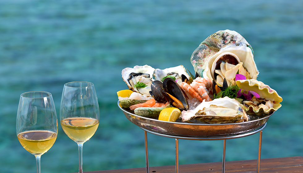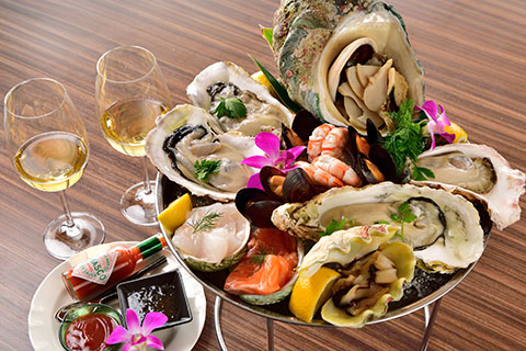 夜光貝やシャコ貝、真牡蠣など7種類のシーフードを豪華に盛り付けたプラッター。シークヮーサーポン酢でサッパリと、あるいはピリリと辛みを感じるカクテルソースで味わうのもおすすめです。