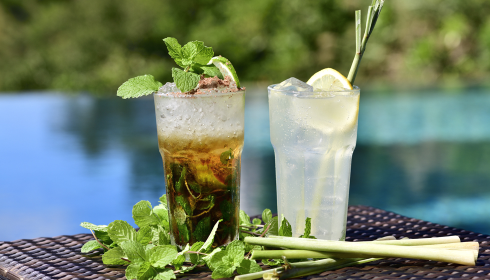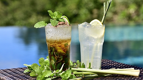 Using an abundance of seasonal herbs harvested from Our Farm, nestled at the foot of Atta Forest, we present two original cocktails to color the early-summer resort evening. Cacao Mojito pairs freshly picked mint with cacao, creating a mojito reminiscent of bittersweet mint chocolate, while Cheerful Kick offers a vibrant blend of tequila brightened with lemongrass-scented cordial vinegar for a lively, invigorating finish.