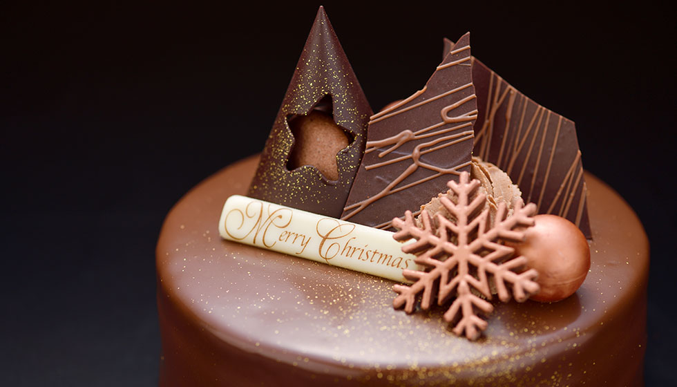 Indulge in a sublime chocolate creation, where the finest French and Belgian couverture chocolates come together in perfect harmony. Moist cocoa-infused sponge is paired with a luscious chocolate cream and finished with a glossy milk chocolate glaze. Handcrafted chocolate accents crown each piece, evoking the festive elegance of the season.