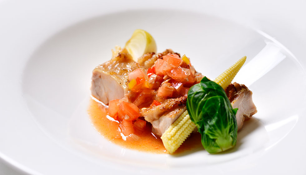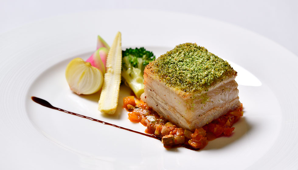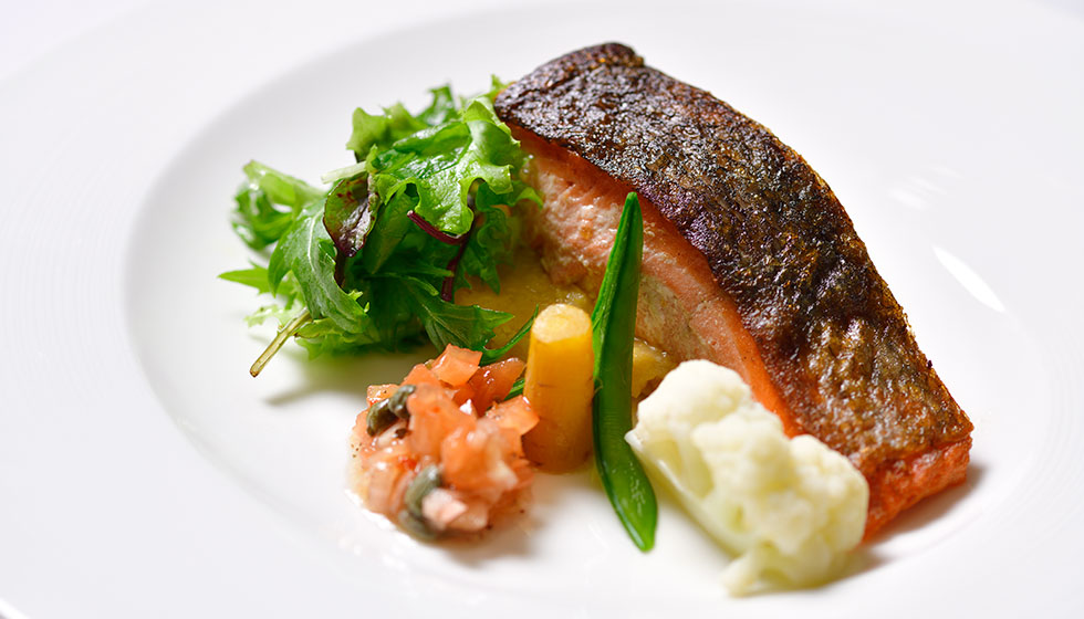 オードブル・サラダ・デザートをブッフェよりお楽しみいただく、セミブッフェスタイルのランチをご用意。日替わりのスープとパスタのいずれかをチョイスし、メインディッシュは魚料理や肉料理など数種類の中から1品お選びいただき出来立てをテーブルにご提供します。緑の映える中庭を望む店内で、優雅なランチタイムをお楽しみください。