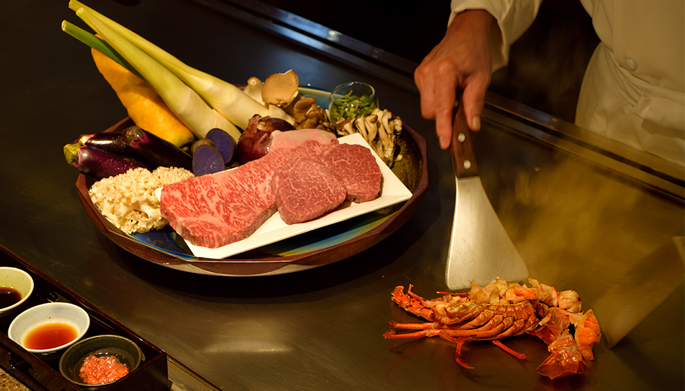 お客様の目の前で食材を焼き上げる臨場感が魅力の鉄板焼レストラン「龍潭」では、メイン料理に石垣牛フィレ肉とサーロインを、そしてフォアグラまで贅沢にお召し上がりいただけるクリスマスディナーを用意しました。イセエビや鮑は目の前ですくい上げ、そのまま調理いたします。クリスマスの夜を華やかに演出する特別なディナーをご堪能ください。