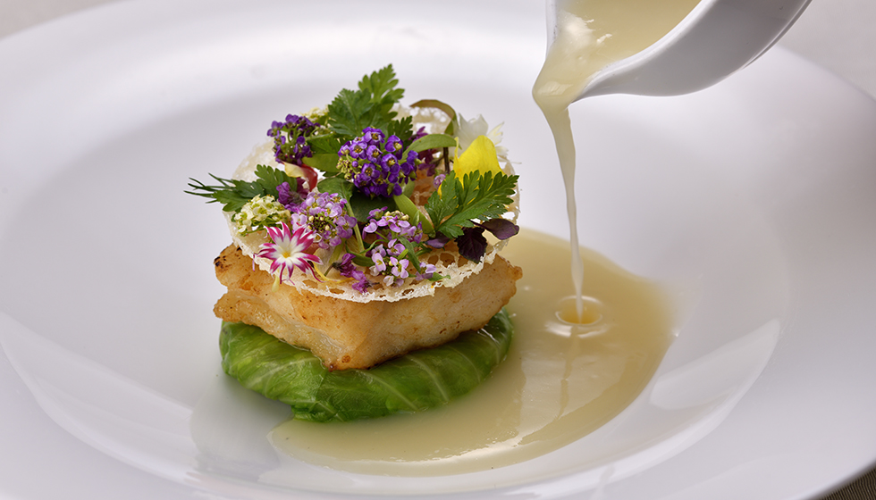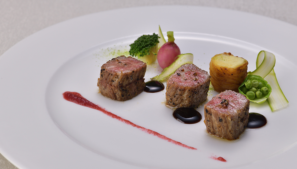 “五感で感じる春の足音”をテーマに、旬の野菜や魚介を用い、彩り豊かに自然の恵みを味わうコースディナーをご用意しました。肉厚のヒラメをふっくらと焼き上げ、エディブルフラワーをふんだんにあしらった魚料理は、アサリのエキスを凝縮したスープ仕立てで。メインディッシュは繊細な火入れで口溶けやわらかく仕上げた和牛のサーロインを、独特の風味をもつ新じゃがいもや春野菜とともにお楽しみください。