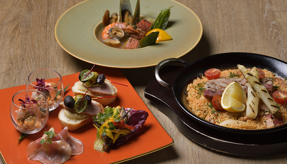 “バルのようにシェアして楽しむ”をテーマに、前菜からデザートまで揃うセットメニュー。この春の魚料理は沖縄県産の赤マチと殻ごと食べられるソフトシェルシュリンプを、魚介の濃厚なだしで味わうソパ・デ・マリスコス(魚介のスープ仕立て)をご用意。肉料理はスペイン産赤ワインで煮込んだ芳醇な「牛肉の赤ワイン煮」を、パエリアは旬のホワイトアスパラガスと島豚ベーコンの旨味を活かした『ラ・シマ』スタイルでご提供します。