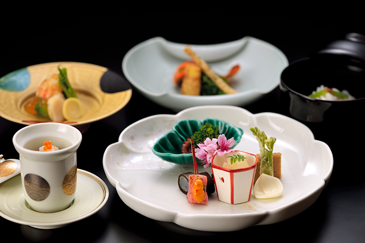 ひと足早い春が訪れる沖縄は、花々の彩りにあふれて夢心地──そんな心に浮かぶ情景を、旬の恵みで味わい豊かに表現した「夢見月会席」。春の海からの贈り物の魚介や、芽吹きの滋養をたくわえた山菜などが、熟練の技と丁寧なしつらえでまたとない美味となり、心華やぐ春夜へと誘います。