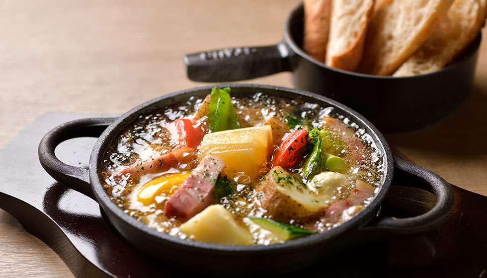 冷えたワインがより美味しく感じられるこの時期に合わせ、白ワインと相性の良い旬の素材をラ・シマスタイルでご提供するレコメンドメニュー。にんにくとベーコンの旨味がとけこんだ熱々のオリーブオイルで、ホクホクの食感に仕上げた初夏野菜のアヒージョや、牛サーロインのグリルはスペイン風野菜の煮込みを添えて。この他、グリーンアスパラガスのジョスパーオーブン焼きなど、旬の香り豊かにご用意しています。