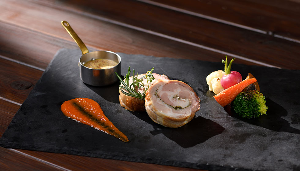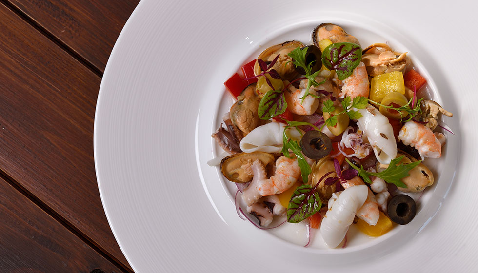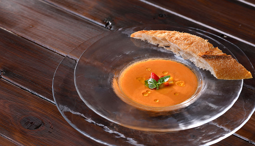“夏のテーブル”をテーマにお届けするレコメンドメニュー。トマトを中心に沖縄県産の野菜も豊富に使用した冷製スープ「ガスパチョ」や、エシャロットビネガーソースで楽しむ「豚肉のエンローラ」など、夏にうれしいメニューをご用意しました。爽やかなシークヮーサーの香りで仕上げる魚介のサラダ「シーフードサルピコン」は、前菜にもおすすめ。