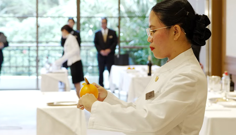 ザ・テラスホテルズでは、料飲サービススタッフの接客技術向上を目的として、2025年12月10日(水)に「第2回 ザ・テラスホテルズ料飲サービスコンクール」を開催いたしました。コンクールにはザ・ブセナテラスをはじめ、ザ・テラスホテルズの4ホテルのレストランから13名のスタッフがエントリーし、お客様のお迎えや挨拶、カクテルの作成、ワインの抜栓や料理の提供、ゲスト役の審査員とのコミュニケーションなど一連のディナーサービスを披露。デザートはゲストの目の前でオレンジをカービングするゲリドンサービスに挑み、日頃の業務で培った能力を発揮するとともにサービス技術を競い合いました。真剣にコンクールに向き合うスタッフの姿を動画にてお届けいたします。