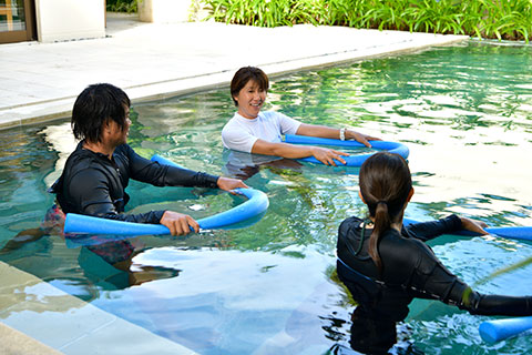 アクアポールを使用して、水の抵抗や浮力を利用した運動法をスタッフがレクチャーしながら身体を動かします。