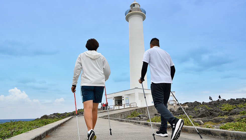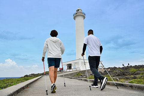 ジ・ウザテラスからは歩いて約15分ほどの距離にある、沖縄本島最西端に位置する残波岬。ノルディックポールを用いてウォーキングを楽しみながら、残波岬の灯台からの景色をご堪能いただけます。