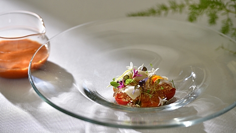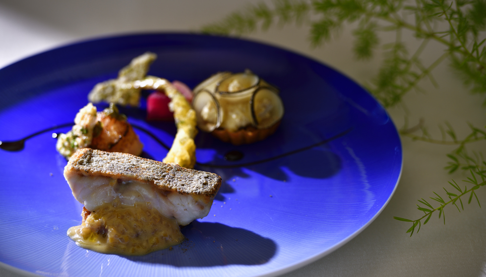 自家農園の野菜やハーブ、読谷村産の農作物を取り合わせ、ここでしか味わえない食体験をお届けするコースディナー「ビアリッツ」。太陽の日差しがひと際輝きを増すこの季節は、夏野菜や柑橘を取り入れ爽やかな味わいに仕上げました。県産夜光貝とアワビのマリネにガスパチョを注いで楽しむトマトのデグリネゾンや、シークヮーサーがほのかに香るソースを添えた鮮魚の米粉焼きなど、味わうごとに口福が広がる夏の美食をお召し上がりください。