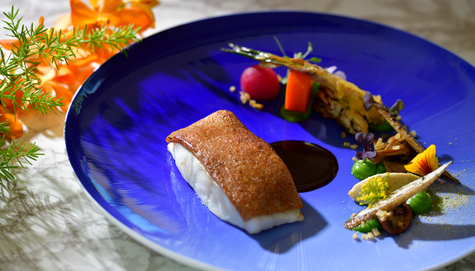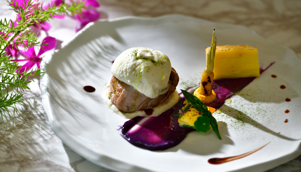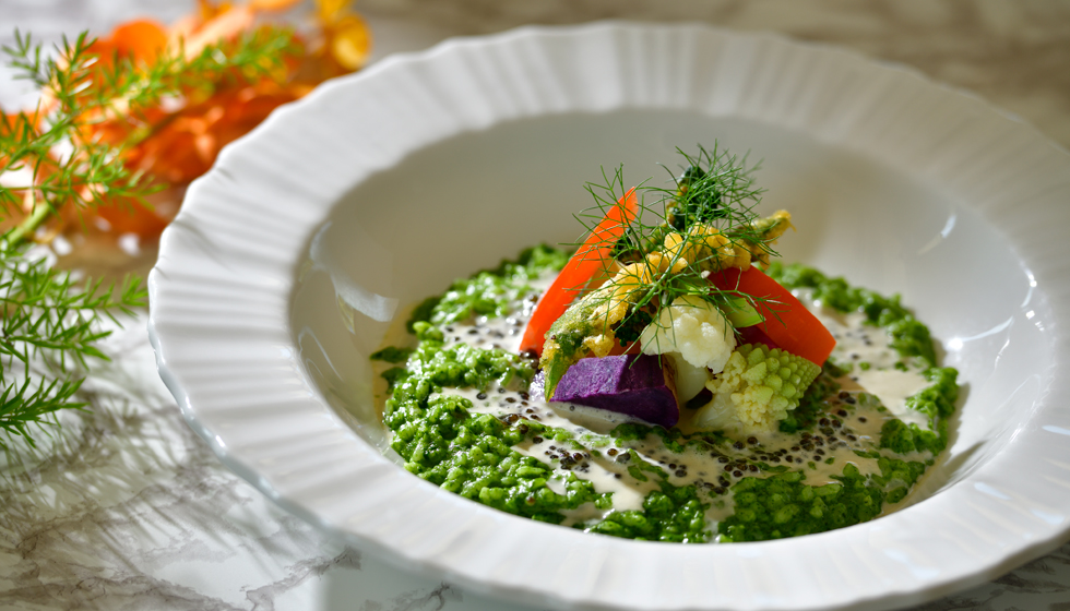 ザ・テラスホテルズでは、2010年よりフランス・コルシカ島にあるミシュランキー※ホテル「グランドホテル ドゥ カラロッサ」(以下、カラロッサ)と、シェフを中心とした人的・文化的交流を継続しております。カラロッサのシェフ、パスカル・カイヨー氏が監修し、2026年2月に開催された賞味会で提供した特別ディナーより、特別な4皿をアラカルトメニューとしてご提供いたします。ナッツや根菜の風味をはじめ、素材の持ち味を活かし、クラシックな技法を現代風にアレンジした料理に、自家農園「Our Farm」の野菜を取り入れ、この土地ならではのエッセンスを添えています。テラスに薫る、フランス・コルシカ島の風をお楽しみください。